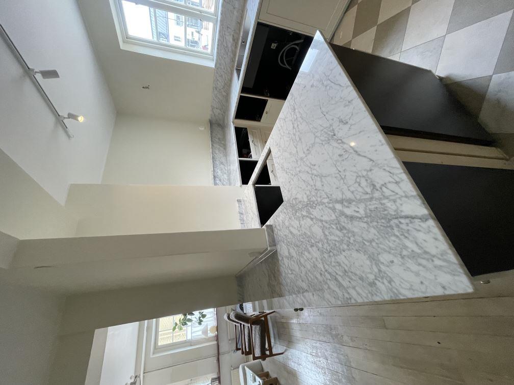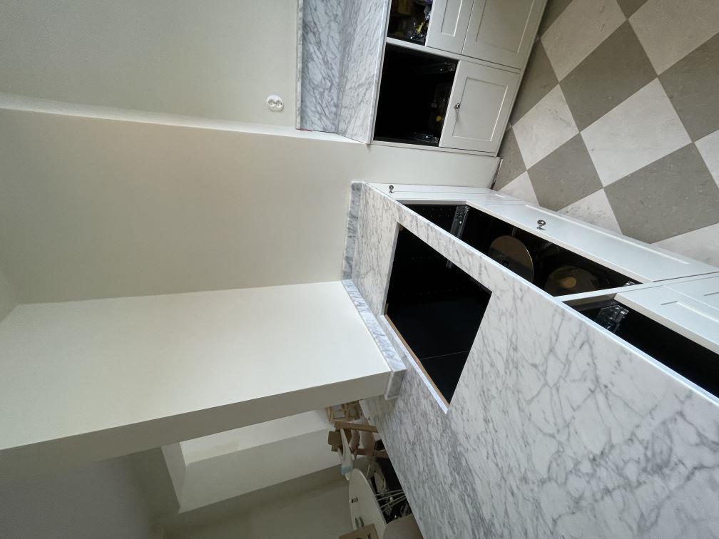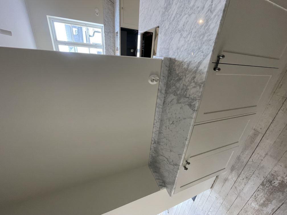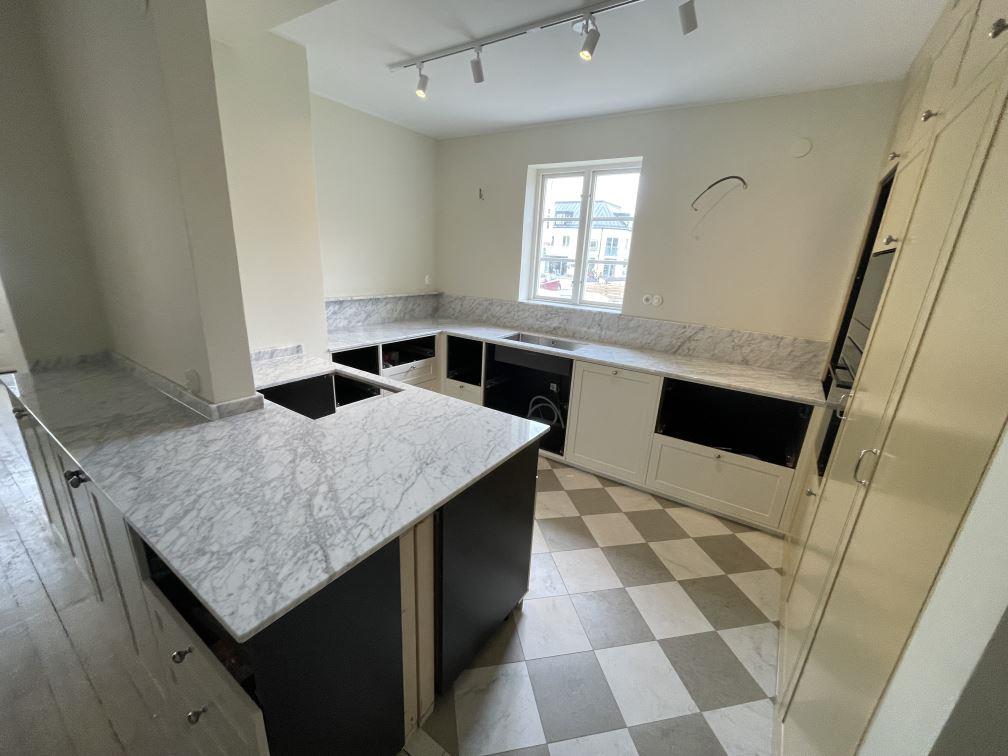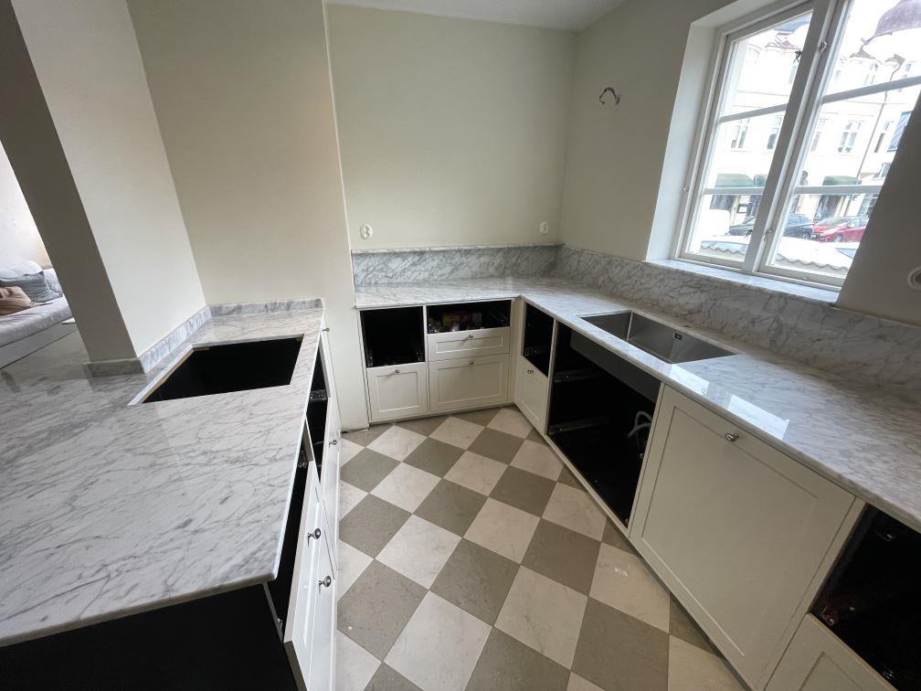 Nytt projekt slutfört i Limhamn. Montering. Mätning. Sten: Carrara C - 20mm Polerad.