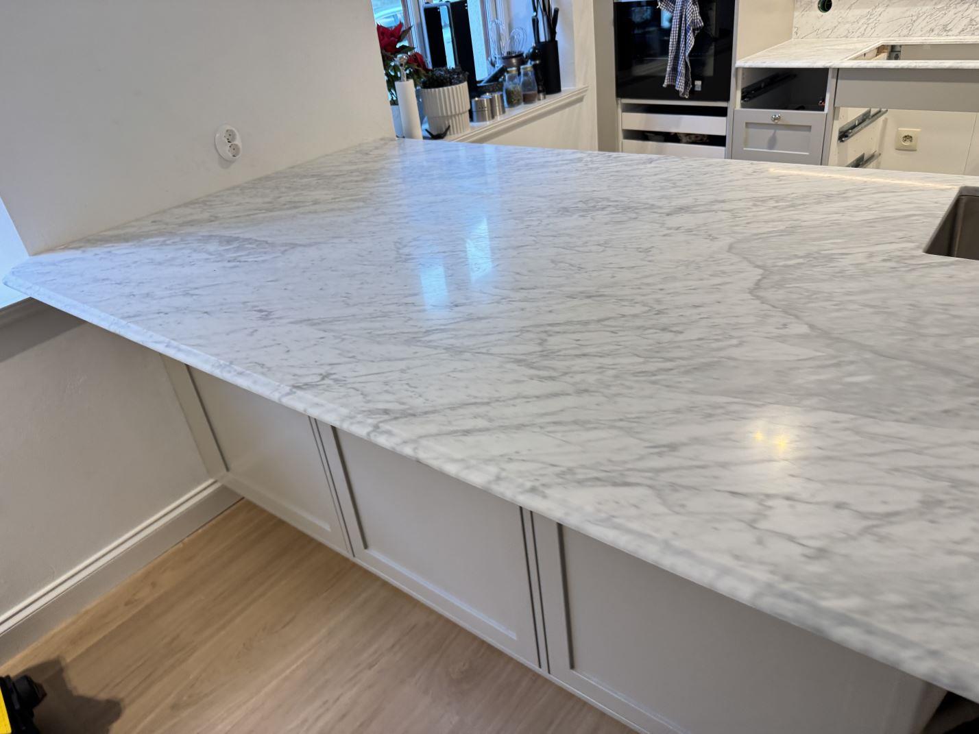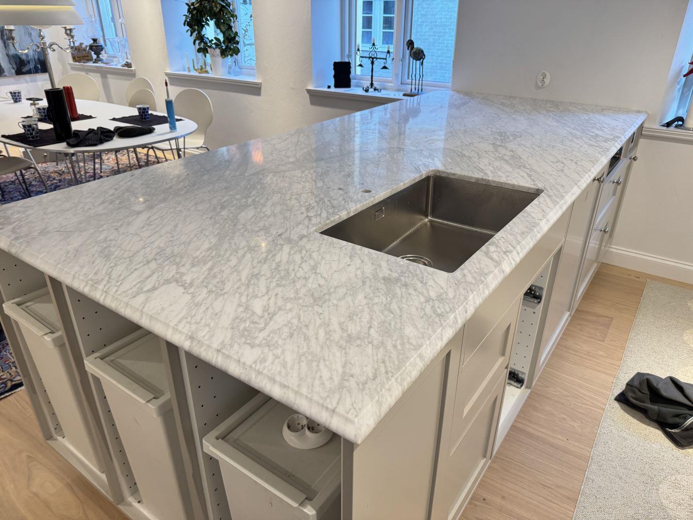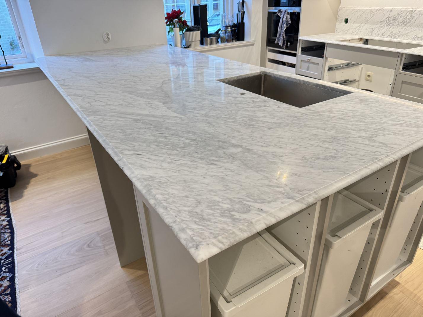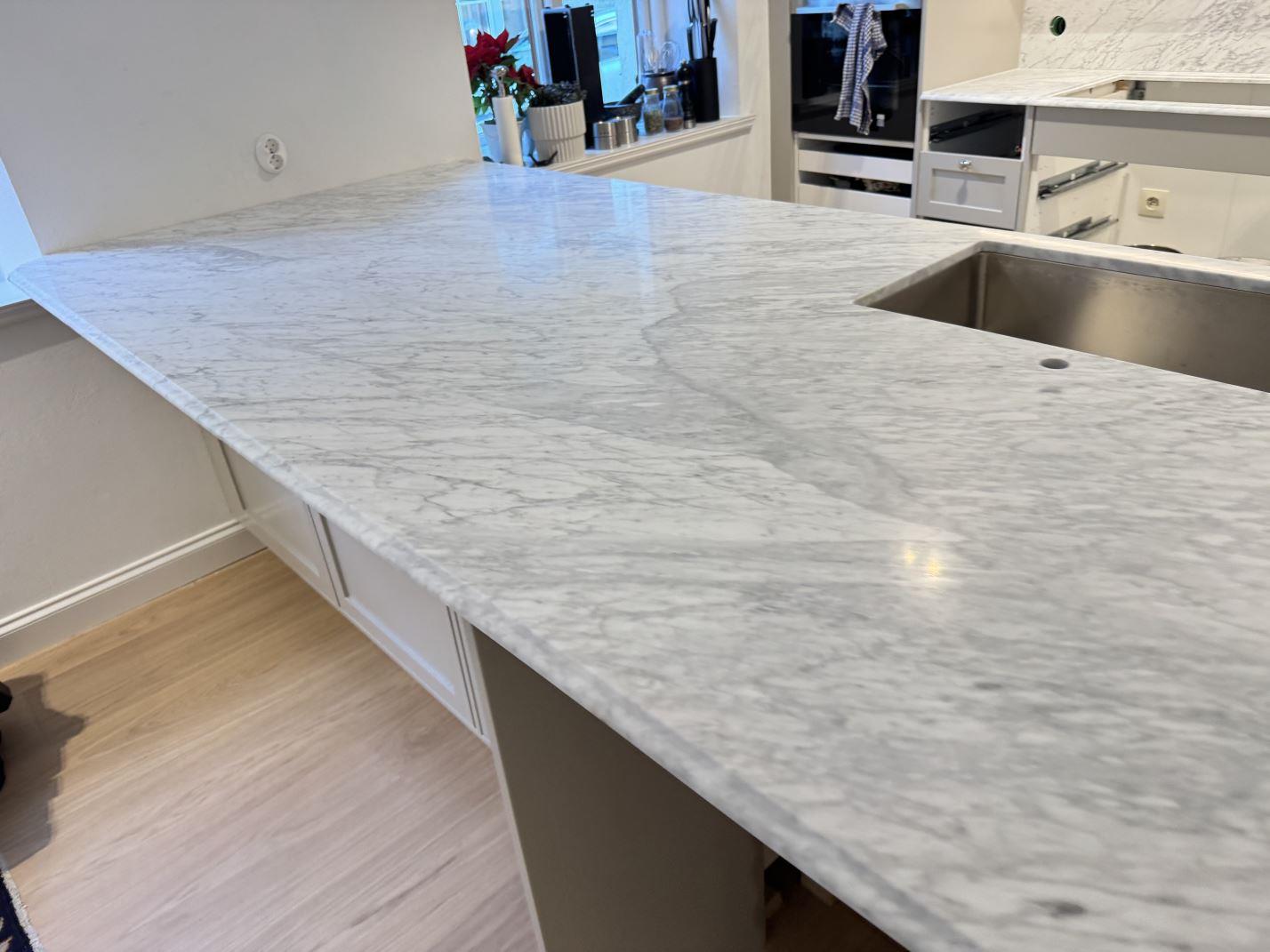 Nytt projekt slutfört i Ystad. Montering. Mätning. Sten: Carrara C - 20mm Matt.