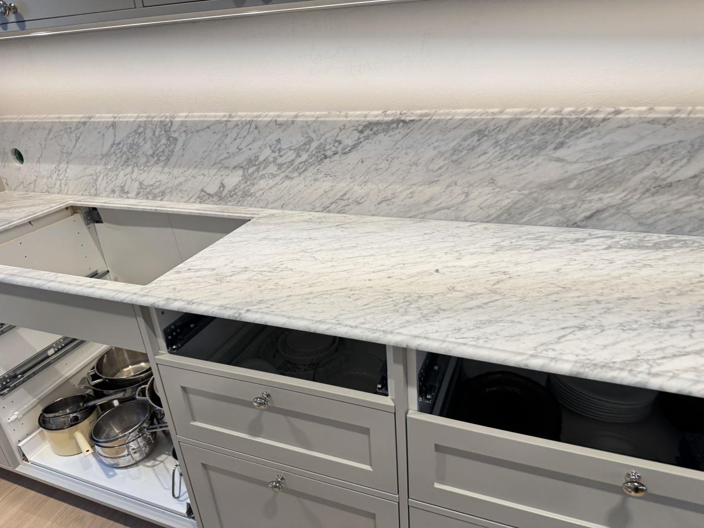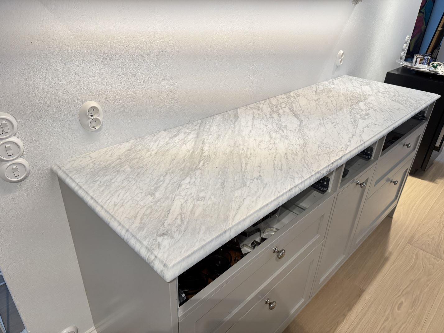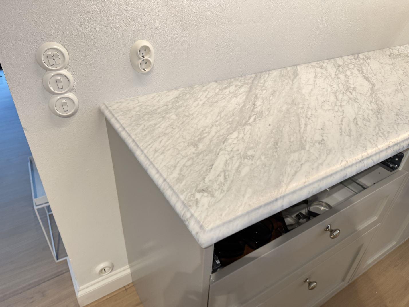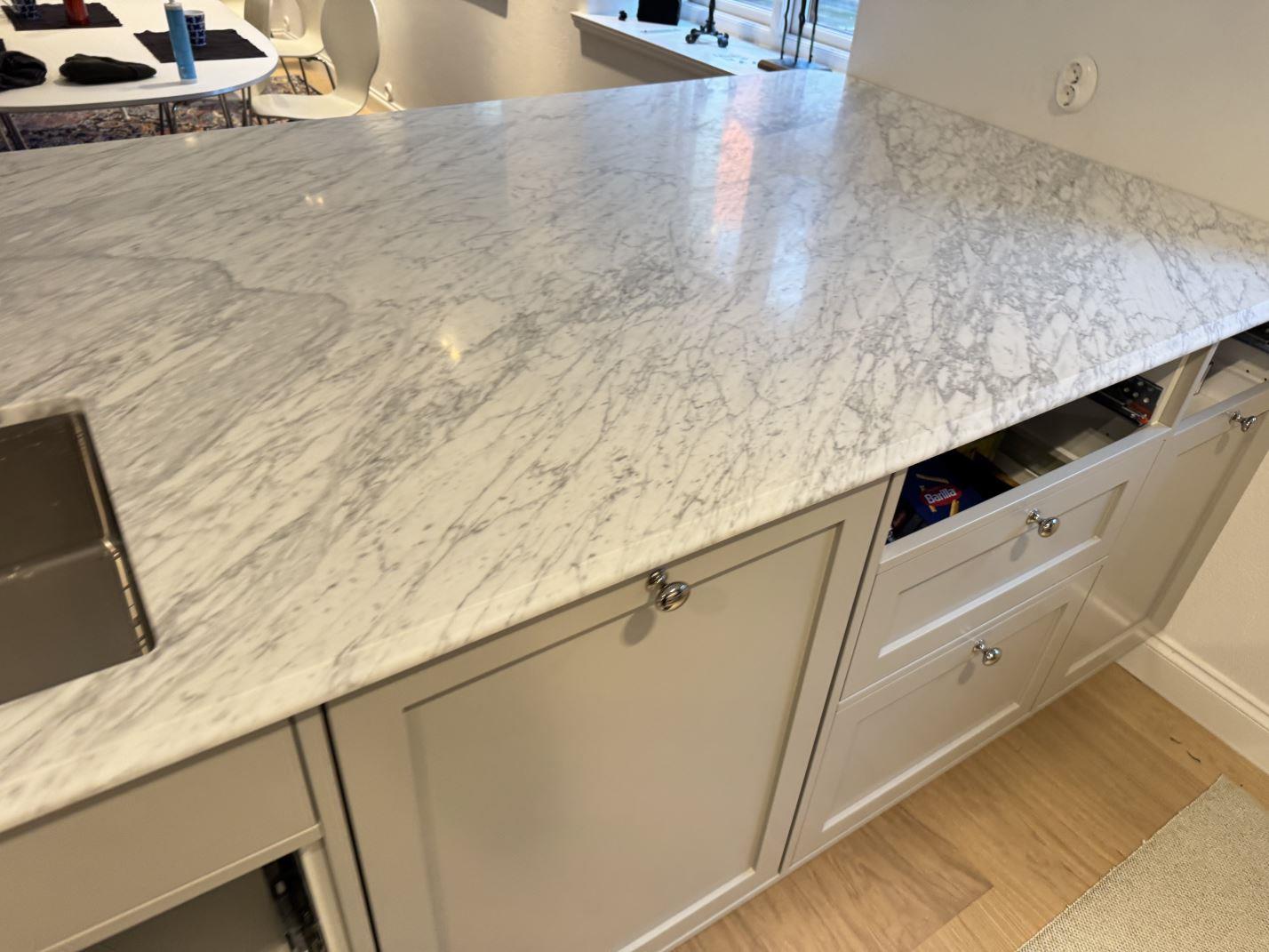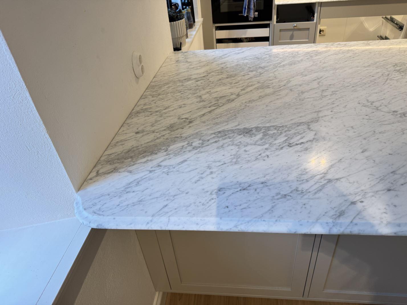 Nytt projekt slutfört i Ystad. Montering. Mätning. Sten: Carrara C - 20mm Matt.