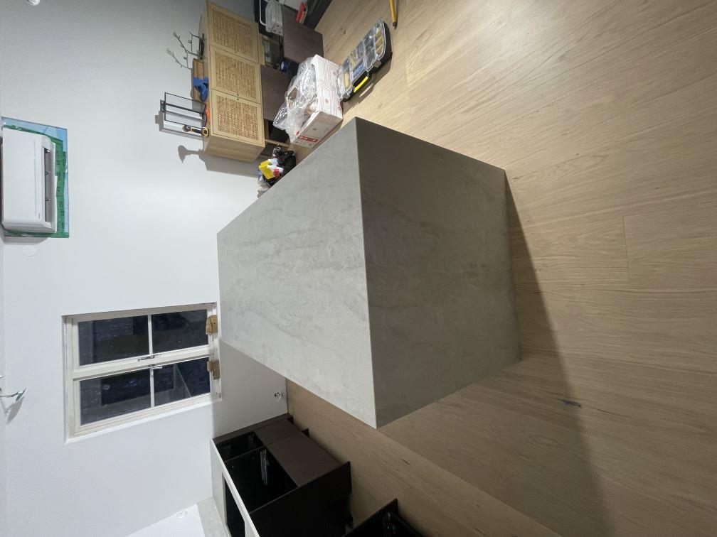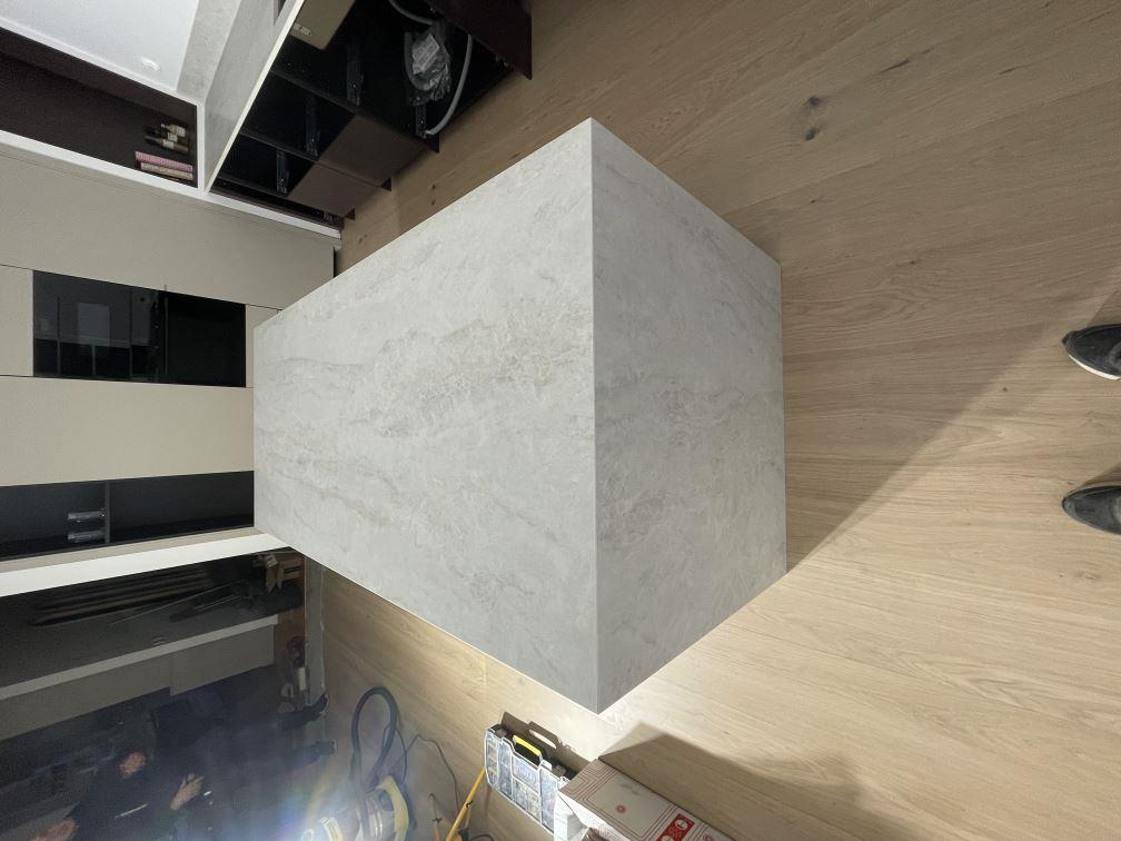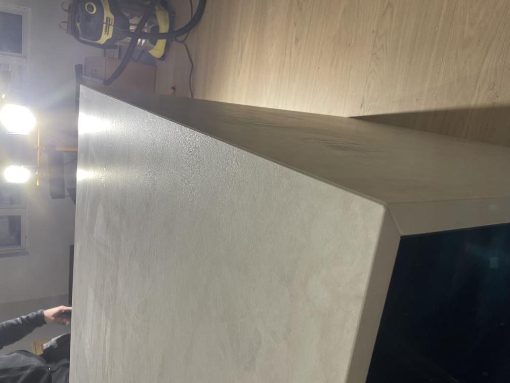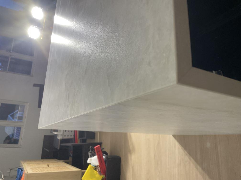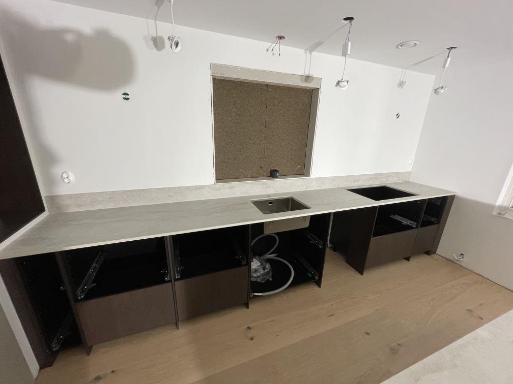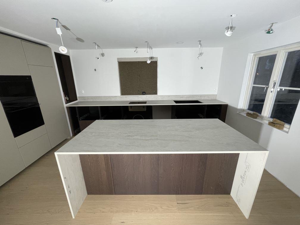 Nytt projekt slutfört i Viken. Montering. Mätning. Sten: Dekton Nara - Matt 20mm,Dekton Nara - Matt 8mm.