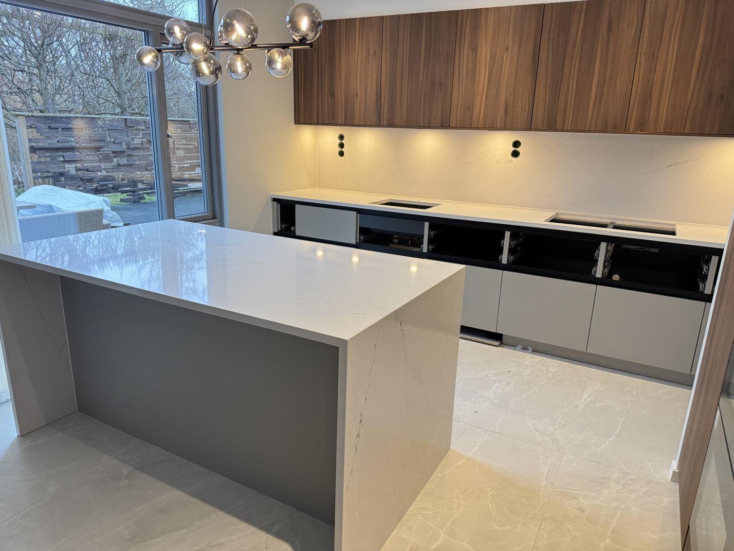 Nytt projekt slutfört i Lund. Montering. Mätning. Sten: Silestone Ethereal Glow - 30mm Polerad,Silestone Ethereal Glow - 12mm Polerad.