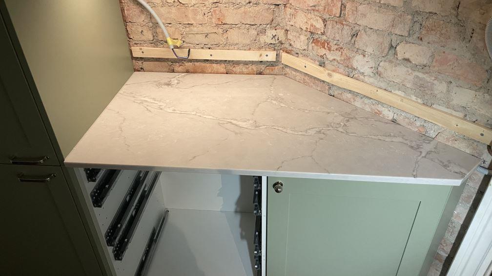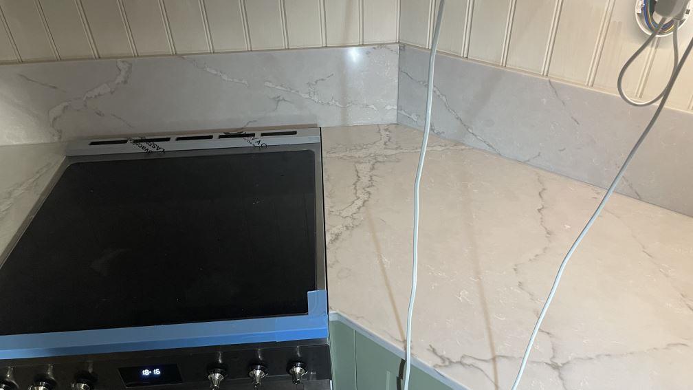Nytt projekt slutfört i Göteborg. Montering. Mätning. Sten: Silestone Victorian silver - 12mm Polerad,Silestone Victorian silver - 20mm Polerad.