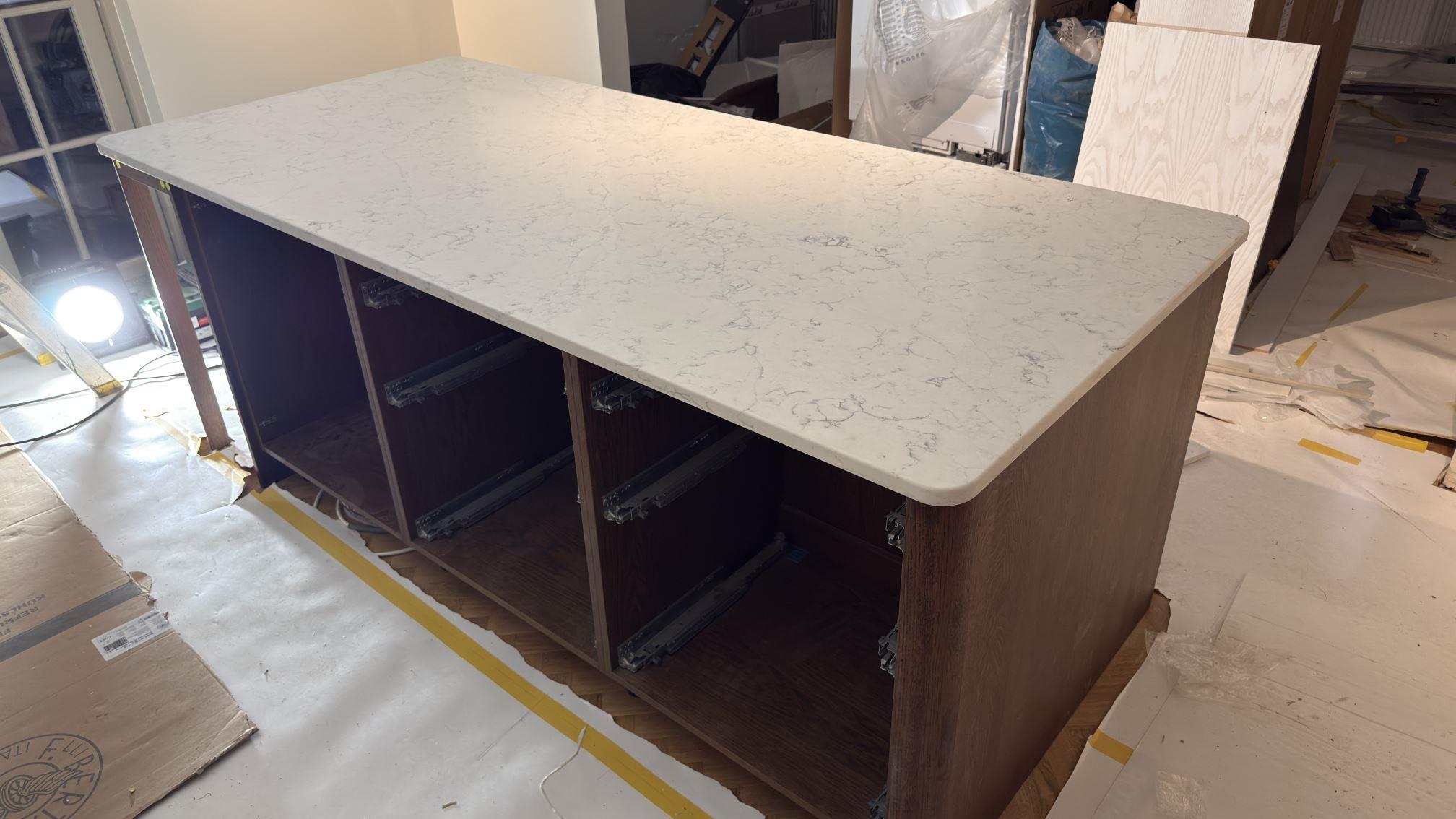 Nytt projekt slutfört i Lidingö. Montering. Mätning. Sten: Technistone Mystery White - 30mm Polerad,Technistone Mystery White - 20mm Polerad.