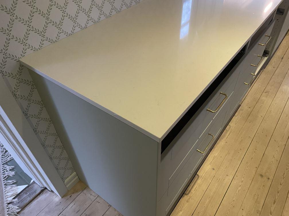 Nytt projekt slutfört i Fjälkinge. Montering. Mätning. Sten: Technistone Noble Supreme White - 20mm Polerad.
