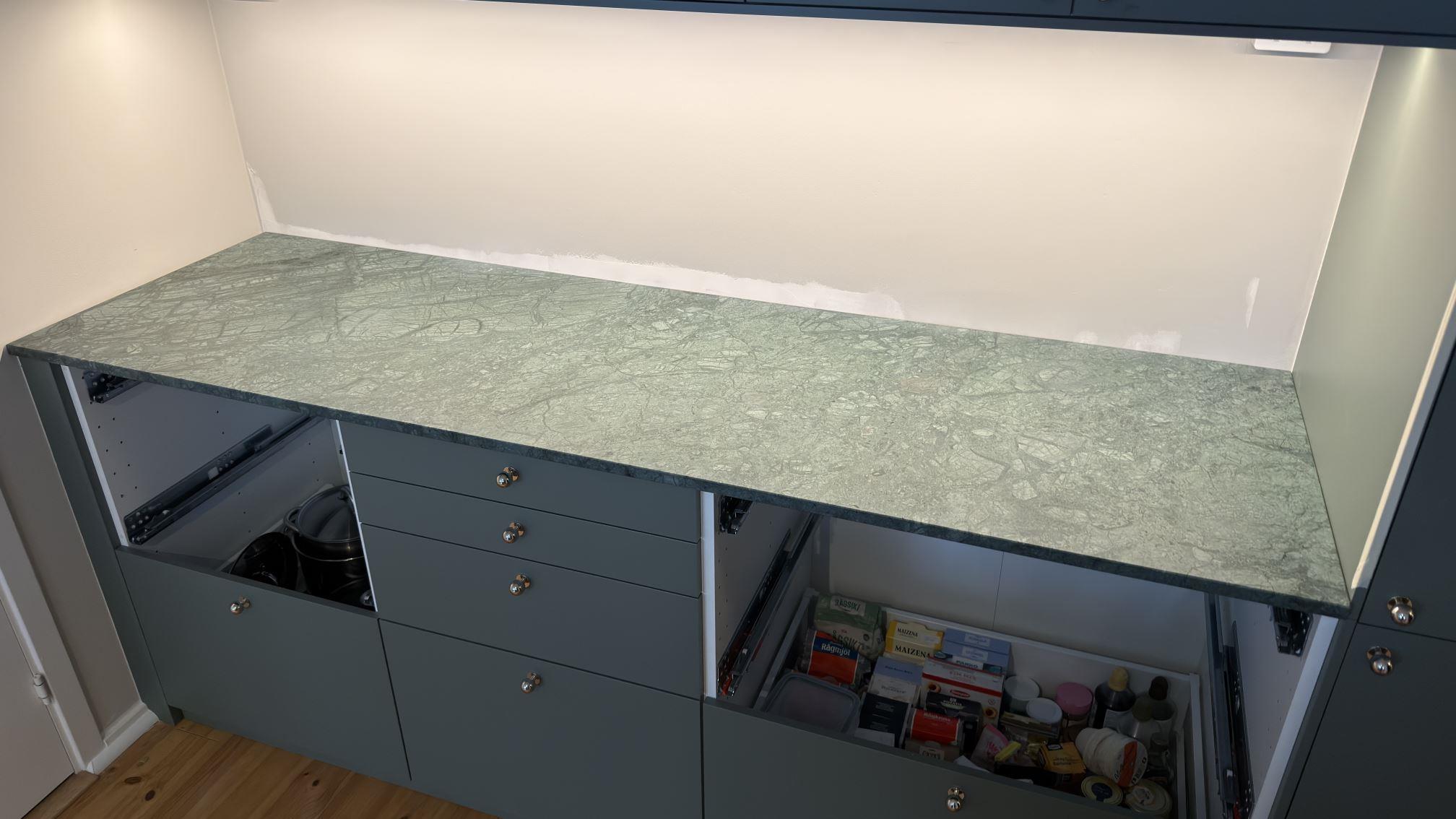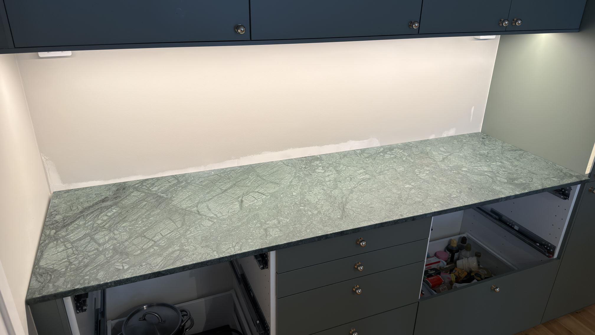 Nytt projekt slutfört i Stockholm. Montering. Sten: Verde Guatemala - 20mm Matt.