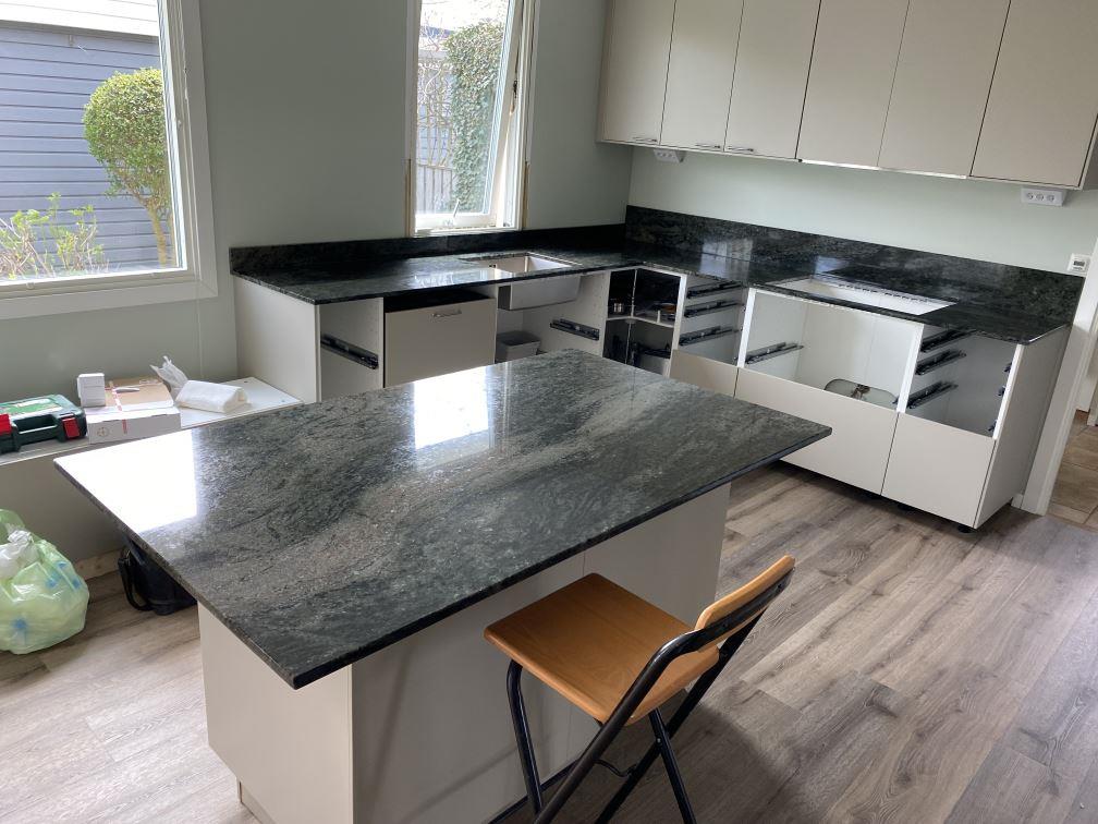 Nytt projekt slutfört i kävlinge. Montering. Mätning. Sten: Verde Savana - 20mm Polerad.