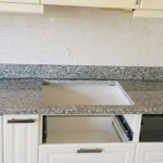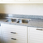 Vacker och slitstark granitskiva i klar gråvit bakgrund som genomkorsas av flagor och fläckar i mörkgrå och svart färg. En mycket uppskattad granitsten.